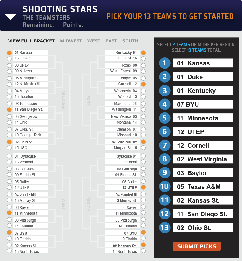 Select 13 teams from the tournament. Your teams will earn bonus points for each round they advance PLUS the seed number of that team. The bonus points increase with each round.