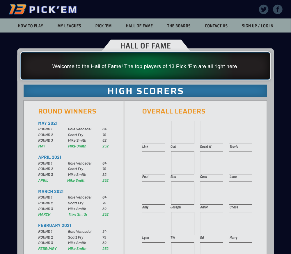 Follow along with the STANDINGS to see how you rank for the DAY, ROUND and MONTH. The winners of the rounds and the months will be eternally etched in the